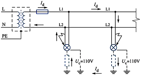 如果水下照明采用交流220V電壓供電,水下設備要求采用隔離變壓器供電,而隔離變壓器供電要求是一臺變壓器給一個設備供電,因為燈具數量較多,采用一臺隔離變壓器只給一臺照明設備供電既不可能也不現實。如果一臺隔離變壓器給多臺照明設備供電(如圖3所示)有兩臺照明器回路的不同導線發生接地故障,兩臺照明器自然接地電阻假設相等均為Ra,則故障電流為Id=Uo/(Ra+Ra)=220/2Ra=110/Ra,其中一臺照明器的接觸電壓Uc=Id×Ra=110V,如果Ra較大,則Id較小,回路首端過流保護器不動作,而接觸電壓遠大于接觸電壓限值UL,可以引起電擊事故。