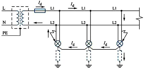 圖3 隔離變壓器給多臺照明設備供電(無等電位聯結)