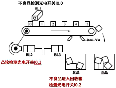 如圖1所示:在傳送帶上有“0”“1”“2”“3”“4”“5”總共6個工位。機械手把產品放在第“0”個工位上,通過光電開關(或者視覺)檢測。當機械手每放入一個產品,傳送帶移動一個工位。當傳送帶每移動一個工位凸輪轉一圈(I0.1檢測到一個信號)。當檢測到不良品時,到達第“4”個工位氣缸推出。當不良品(次品)掉入箱體里,I0.2將檢測到一個信號從而氣缸可以縮回。