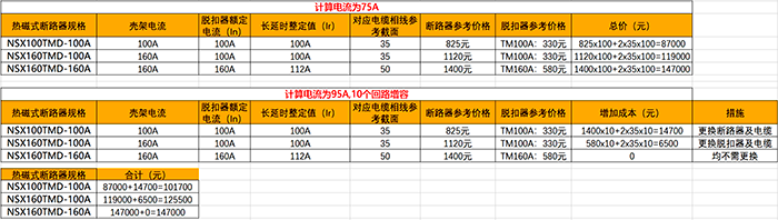 方案二NSX160TMD-100A在考慮20%的余量情況下,又考慮了60A(約90%)余量,但是這60A余量是不能直接拿來用的,沒有即戰力,只能更換脫扣器才可,這樣多出來的脫扣器成本(TM160為580元,TM為330元)成了擺設。