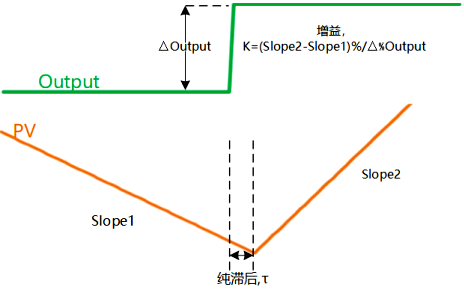 從開環響應的63.2%ΔPV,沿響應曲線向前做響應曲線的切線,切線與時間坐標軸相交。輸出變化到交點為純滯后時間τ,交點到63.2%ΔPV的時間為時間常數T。