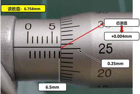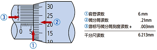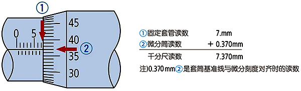 帶游標刻度的千分尺在套管基線的上面有游標刻度,此時的讀數方法如下圖所示: