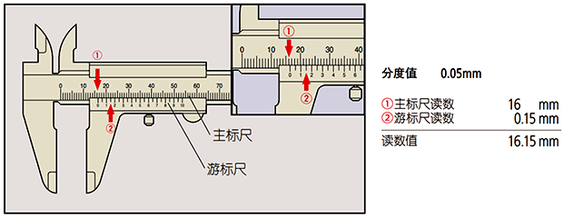 這意味著,隨著卡尺量爪打開,每次連續移動0.05mm均會使后續游標尺線與主標尺線重合,所以計數單位為0.05mm?;蛘?,可使一個游標分格比主尺的兩個分格短0.05mm,以形成長游標尺。這使刻度更易讀,但原理和分度仍相同。