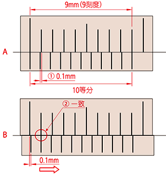 見①如B圖滑塊向右方移動0.1mm時,與主標尺第2根刻度重合…進行步驟②,讀取到0.1mm。