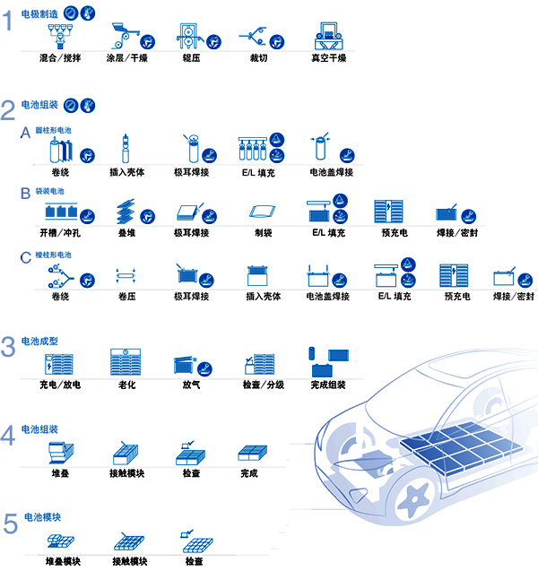 電池生產產細分為電極制造、電池組裝、電池成型、電池組裝和電池模塊五個大的生產環節,如下圖所示: