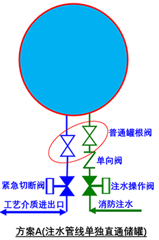 方案A:注水管線采用獨立的一根管線,直接和儲罐連接,管線上設置罐根閥+單向閥+注水操作閥(可遠程操作),其中罐根閥常開,注水操作閥常關。方案A的優勢在于注水線不受工藝介質管線的影響,注的消防水能直接通到罐內,并且注水線的管道尺寸和壓力等級可以單獨設計,注水量能得到保證。方案A的劣勢在于,在球罐上多了一個開孔,并且相連接的管線閥門法蘭都成了潛在的泄漏源。