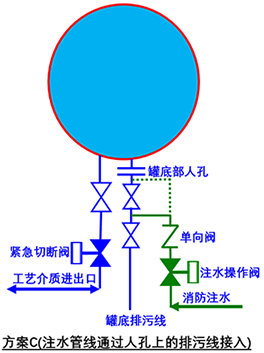 方案C:注水管線通過接入罐底部人孔蓋上的排污管線實現注水。該方案在很多企業里確實存在,方案C的優勢在于,既避免了罐壁上開孔,也不受工藝介質管線狀態的干擾。看起來相對比較完美,但是這種方案的劣勢在于人孔蓋上的排污管線,一般和切水管線都是同一根管線,所以管道的尺寸一般不會太大,常見的DN50-DN80之間,注水量很可能是不滿足的,所以采用方案C,前提是必須注水量計算通過,否則無法適用。