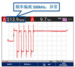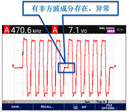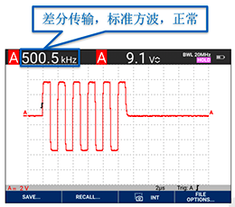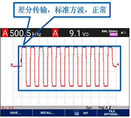 從Fluke190III示波表采集的波形中,我們可以看到這些異?,F象:模塊發送的頻率不正確,傳送過程中有非方波的成分出現,非差分傳輸。