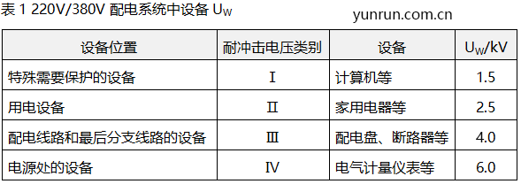UW反映了電子產品對過電壓的耐受能力。低壓配電系統和電子系統中的設備對外界的電壓波動較為敏感,抗干擾能力較弱。220V/380V三相配電線路中各類別設備UW見表1,可以看到計算機UW僅為1.5kV。而工業場所所用設備信號端口,例如I/O信號端口根據標準要求承受1kV的電涌沖擊,承受能力較弱,容易損壞 。