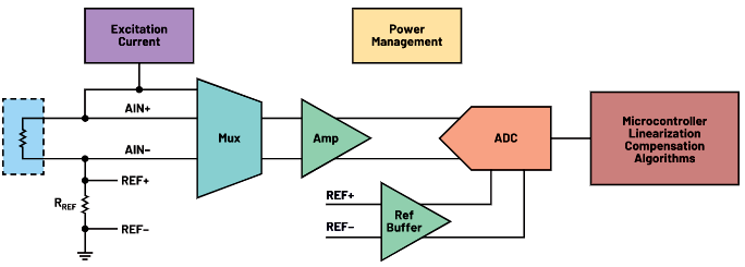 請注意,檢測電阻(電壓激勵)或參考電阻(電流激勵)的初始容差和漂移必須很低,因為這兩個變量均會影響系統總體精度。