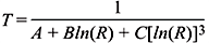 A、B、C是從三個溫度測試點得出的常數;R為熱敏電阻的阻值,單位為Ω;T為溫度,單位為K