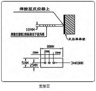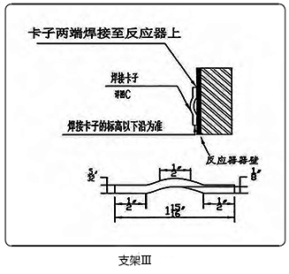 ③支架III:每床層8個,支架II間均勻分布,用于熱電偶固定。這種方案只要前期設計準確,安裝是比較方便靈活的,且預埋件體積小,數量少,可有效減小焊接對反應器器壁堆焊層的影響。
