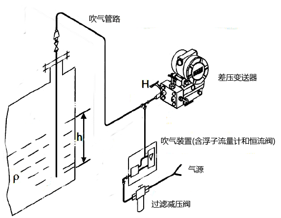 吹氣式液位計可對敞口或密閉容器內的液體進行測量。除吹氣管與被測介質接觸外,吹氣裝置主要設備和液位變送器的測量元件均不與被測介質接觸,結構簡單可靠,從而保護了測量元件,減少了儀表的維護量,增加了測量的可靠性。吹氣式液位計除了能測量普通液體的液位外,特別適用于惡劣環境下,例如腐蝕性液體、黏度較大液體、易結晶液體、高溫液體的液位,廣泛應用于石化企業中。