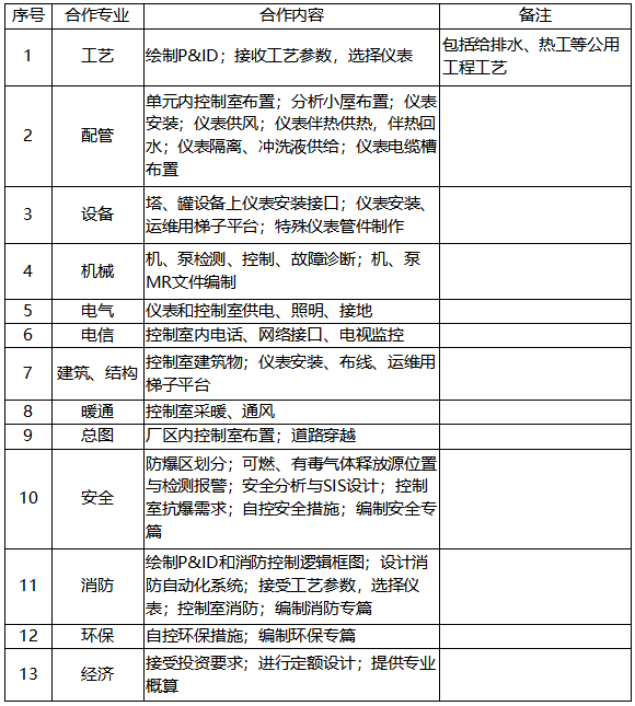 自控設計合作貫穿于自控專業與工藝專業、配管專業、設備專業、機械專業、電氣專業、電信專業、建筑/結構專業、暖通專業、總圖專業、安全專業、消防專業、環保專業、經濟專業等之間,彼此牽制彼此配合。本文詳細介紹自控工程設計之自控專業與電信、建筑/結構、暖通、總圖、安全、消防、環保、經濟專業的設計合作。