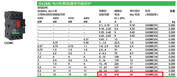 回到文章前面,空壓機額定功率11.2kW±7%,工作電流為23.5A+20%/-10%,即21A~28A。我們選擇過載保護整定電流范圍為24~32A的GV2ME32C電動機保護斷路器,保證電動機的額定電流落在斷路器整定電流范圍之內。