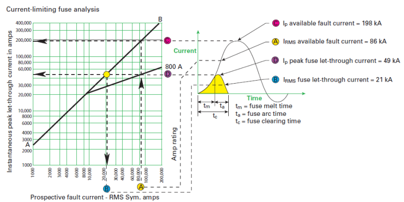 例如,某電氣系統的預期短路電流為86kA(A點),預期短路電流峰值為198kA(C點)。斷路器或熔斷器的額定電流為800A,其短路分斷能力至少為86kA,只有這樣才具備分斷預期短路電流的能力。