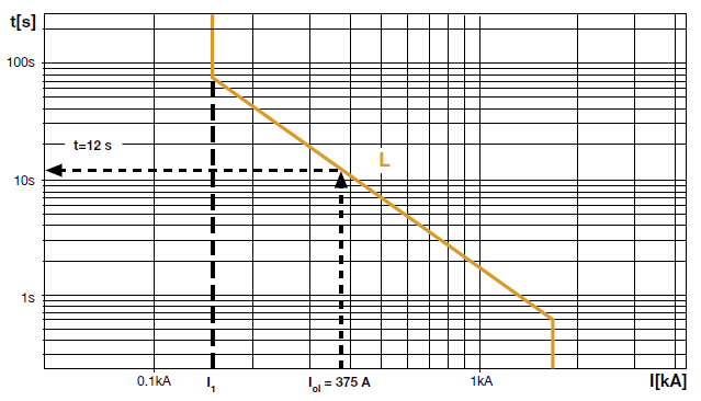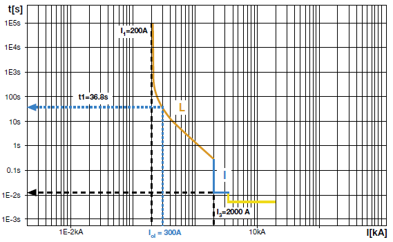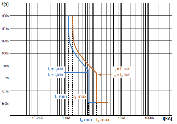 介于I1max和I3min之間的電流,斷路器的過載保護會動作,動作時間范圍介于該電流對應的垂直線與反時限曲線的兩個交點之間。