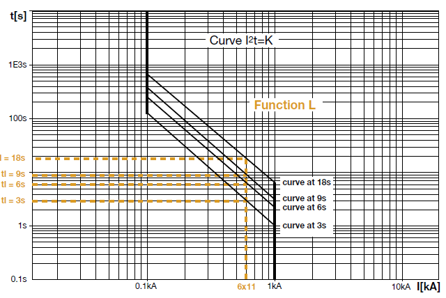 ABB在其白皮書中將長延時保護的反時限曲線的允通能量定義為常數即I2t=K如,下圖所示。通常長延時保護的延時時間一般默認為6Ir所對應的時間,常見的有3s,6s,9s和18s等,時間數值越大,代表斷路器在6倍Ir的過電流下的保護延時時間越長。