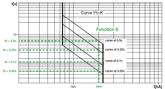 短延時反時限保護I2t ON的理解與前面長延時保護有點類似,都是遵循I2t=K,故障電流越大,動作時間越短。ABB的Emax框架斷路器和Tmax塑殼斷路器分別是以10In和8In作為延時時間的電流基準,例如以0.5s(Tmax@8In)為參考,利用I2t=K等式,可以求出短延時反時限區域其他電流下的延時時間。