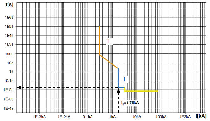 瞬時保護I曲線所對應的電流值,當故障電流大于等于瞬時保護整定值時斷路器動作(藍色線)時,瞬時保護立即動作。
