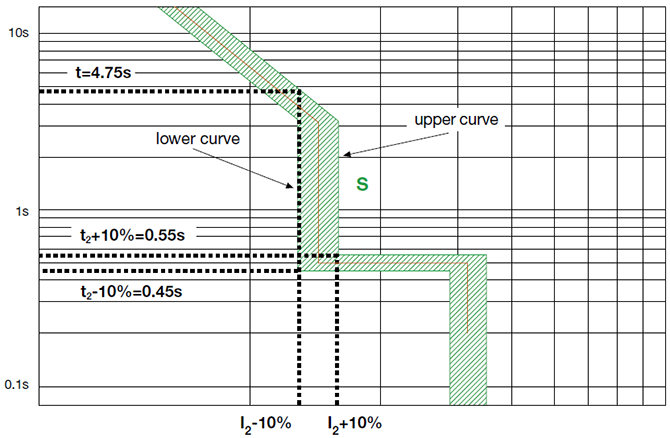 ②當故障電流介于I2-10%和I2+10%之間時,斷路器動作時間范圍為0.45s~4.75s;