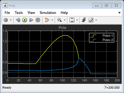控制器性能根據設定值跟蹤和干擾抑制進行驗證。反應器濃度CA設定點從原始的8.57(低轉化率)過渡到2(高轉化率)kmol/m^3。在過渡過程中,反應器首先變得不穩定,然后再次穩定(見上側極點圖)。