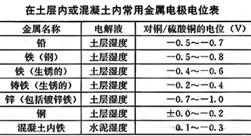 執行本條文時,很多人心里是存在疑問的,為什么同樣是鋼,在基礎混凝土里的和在建筑物外部土壤中埋的,怎么就屬于“不同材料”了?其實這是大家的一般認知產生了誤解。在接地裝置中,一般按埋在混凝土內的鋼材、熱鍍鋅鋼、電沉積銅包鋼、不銹鋼、銅、鉛等幾個分類考慮,因為這些材料都具有典型的自身電位,需要考慮材料的整體電位表現。一般以銅/硫酸銅為基準時的各種材料的相對電位如下表:(配四P1409)