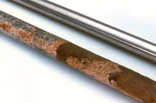 因此,在室外土壤中埋設的接地極或外引接地線可采用不銹鋼(鉻≥16%,鎳≥5%,鉬≥2%,碳≤0.08%,316L),基本上不銹鋼的電位還要略高于銅或埋入混凝土的接地極。如果可行,包銅或鍍銅產品也是較好的選擇,根據文獻所述:“應注意到埋入混凝土內的普通鋼材(裸露或熱浸鍍鋅)與埋入土壤內銅材的電化學電位相等”,因此銅材質是非常合適的,但也需注意,建筑內埋設的銅水管等裸銅產品為了防止電化學腐蝕,常見需要加一個塑料的絕緣段。下圖為埋設2.5年后的熱鍍鋅扁鋼和不銹鋼的對比狀態: