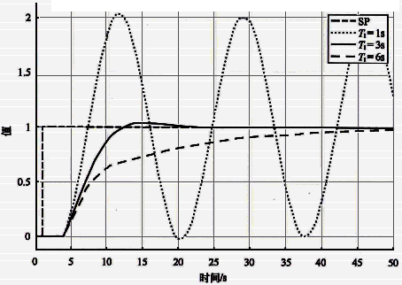 可以保證設定值階躍響應有超調無振蕩。通過多次的設定值階躍響應可以得到和前面一樣的結論:純比例控制器總是有余差。為了消除余差,可以使用比例積分控制器。積分作用通過對偏差的累積消除余差,偏差累積的速度應該和被控對象的動態特性時間常數相匹配。我們使用基準模型、Kc=0.25和不同積分時間進行閉環設定值階躍測試。設定值階躍響應曲線如圖1所示。當積分時間太小(積分作用太強)時,設定值階躍響應會超調甚至振蕩。當積分時間太大(積分作用太弱)時,設定值階躍響應緩慢,表現為“拖尾”現象。合適的積分時間應和被控對象的時間常數匹配。
