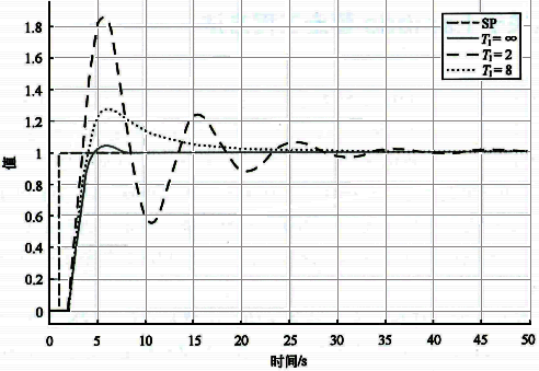 不同積分時間的設定值階躍響應如圖5所示??梢钥闯觯杭儽壤徽袷?,積分作用太強了引起振蕩,積分作用弱了消除余差比較慢,增強積分作用閉環響應超調更嚴重,更容易振蕩。增加積分作用后過程變量的超調量明顯增加,這是由積分對象的積分作用和比例積分控制器的積分作用的雙重作用造成的。最佳的積分時間能最快速消除余差而且還不會引起振蕩。