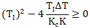 閉環傳遞函數的兩個極點位置決定了被控對象是否振蕩。根據韋達定理,極點的位置取決于根的情況由判別式(△=b2-4ac)決定,當判別式大于等于0方程式有兩個實根時,被控對象階躍響應不振蕩,否則方程式有兩個共軛虛根,被控對象階躍響應振蕩,得公式31和公式32。