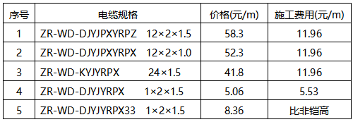 從下表中可以得出,如果主電纜線徑由目前的1.5降低為1.0mm2,每米主電纜可節省16元,分支電纜由鎧裝修改為非鎧裝,每米電纜的費用至少可降3.5元。