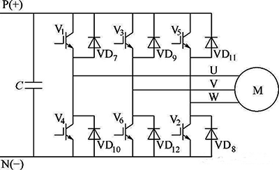變頻器的IGBT是單向元件,只能單向導通,為了給電機與電源提供一個反饋通路,故在每只IGBT上反并了一個二極管,只不過,反饋的電能用于對電容充電。如下圖: