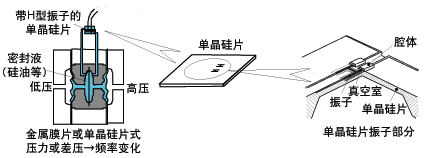 在單晶硅芯片上采用微電子機械加工技術(MEMS),分別在其表面的中心和邊緣制成兩個形狀、大小完全一致的H形諧振梁,且處于微型真空腔中,使其既不與充灌液接觸,又確保振動時不受空氣阻尼的影響。硅諧振梁處于由永久磁鐵提供的磁場中,與變壓器、放大器等組成一正反饋回路,讓諧振梁在自激振蕩回路中作高頻振蕩。當單晶硅片的上下表面受到壓力并形成壓力差時,硅片將產生變形,導致中心諧振梁因壓縮力而頻率減小,邊緣諧振因受拉伸力而頻率增加,因而使兩個H形諧振梁分別感受到不同應變作用,其結果是中心諧振梁因受壓縮力而頻率減少,邊緣諧振梁因受到張力而頻率增加,兩個頻率之差對應不同的壓力信號。