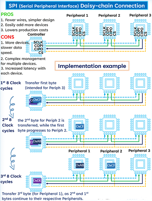 在我們使用一個控制器和三個外設實現菊花鏈SPI的示例中,數據傳輸在幾個時鐘周期中發生,每個時鐘周期由8個時鐘脈沖組成,說明了字節在外設之間的順序傳播。