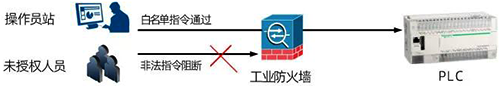那么第2種方案,在工控設備前部署安全防護設施是目前比較可行的防護方案。通過在PLC前部署工業防火墻,來對PLC設備進行安全防護的功能,如下圖所示: