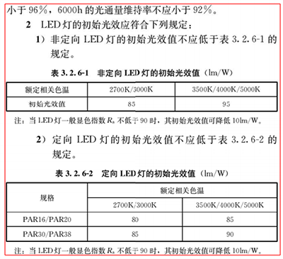 表3.2.6-1與表3.2.6- 2中分別對LED燈具不同色溫的初始光效值給出相應的規定,對于顯色指數Ra不低于90的燈具,可降低10lm/W,同時還對LED細分為非定向與定向2類。