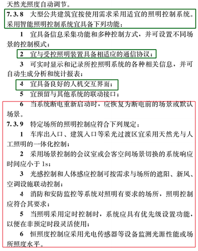 這些條款中改動的地方較多,比如7.1 照明電壓,7.3 照明控制等細節方面的調整;新增內容包括不限于7.3.7 中增加了公眾建筑走廊和樓梯間、校園、酒店大廳、老人空間的照明控制措施、7.3.9 中特定場所的照明控制等等內容,這些都是與舊標準有所不同,所以建議大家還是好好看一看,重點關注,相信一定是有很多收獲的。