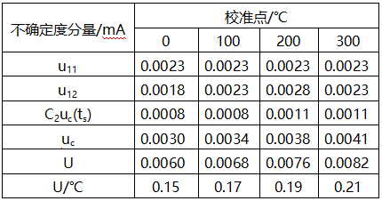 故帶傳感器的溫度變送器在-50~350℃測量范圍內的擴展不確定度:U=(0.0060~0.0082)mA=(0.15~0.21)℃,k=2