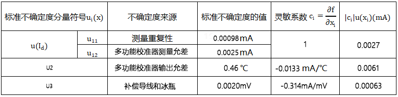 (1)由溫度變送器的輸出電流的測量重復性和多功能校準儀的測量誤差引起的不確定度分量u(Id)