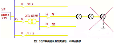 實際工程時常出現錯誤的應用,如下圖所示的SELV回路,安全隔離變壓器后面的燈具外殼接地。這是用電設備金屬外殼接地的“慣性”思維所致!