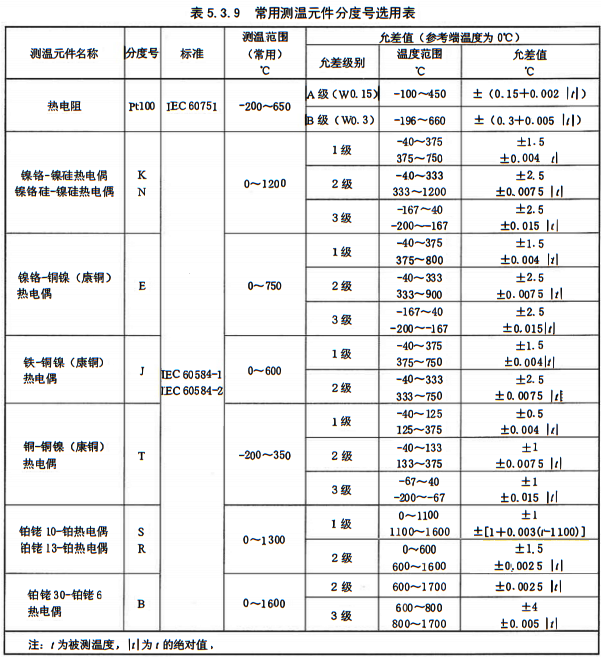 ⑦溫度測量范圍大、有振動場合宜選用熱電偶。熱電偶可選用K、N、E、J、T、S、R、B分號且,應符合IEC60584-1及IEC60584-2標準,測溫范圍和允差值應符合表5.3.9規定。