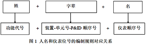 參考家譜中人名的編制方法,采用功能代號-裝置號-單元號-P&ID順序號-儀表順序號的儀表位號編制方法是把儀表位號中的“功能代號”、“裝置-單元號-P&ID順序號”和“儀表順序號”,分別對應家譜中“姓”、“字輩”、“名”三個部分,如圖1所示。