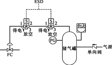 某些因誤停車而引起較大經濟損失的工藝過程,可以采用雙電磁閥配置實現切斷閥電磁閥信號線路的冗余配置,以減少因電纜斷線引起的誤停車。氣路的設計原則有以下幾方面。