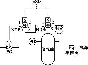 開雙電磁閥配置中,兩路信號電纜宜采用獨立路徑敷設。得電聯鎖配置中,聯鎖控制系統對信號電纜宜設置“Line Monitoring”,及時監測到信號電纜斷線故障,并提示維護人員及時維修,一定程度上降低了因信號電纜斷線而不能執行聯鎖的可能性。儲氣罐配置中,宜設置遠傳壓力指示報警。切斷閥宜采用彈簧復位型。雙電磁閥配置如圖4~9所示。