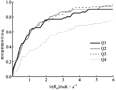 為了提供更多的定量支持以證明這個論點,根據r(WZn)值將樣本分為四組。第一組(Q1)包括所有|r(WZn)|小于等于第一個四分位數的樣本[|r(WZn)|≤0.25mK/a],見表2。第二組(Q2)包括所有|r(WZn)|大于第一個四分位數且小于等于第二個四分位數的樣本[0.25mK/a<|r(WZn)|≤0.78mK/a]。類似的定義用于定義第三和第四組樣本(Q3和Q4)。在四組樣本中分析|r(Rtp)|,并繪制類似于圖2的累積概率百分比圖7,圖中包含了4組累積概率。從圖7可以看出,有相當一部分數量的樣本的|r(WZn)|偏大(Q3和Q4),而其|r(Rtp)|很小。在Q3中有1/3的樣本,其|r(Rtp)|小于0.5mK/a,而這樣的樣本在Q4中占比為1/4,這些樣本的|r(WZn)|都高于0.78mK/a。此外,Q1、Q2和Q3的累積概率百分比圖中曲線走向趨勢非常相似,這說明使用測量Rtp來評估WZn(或Wx)是否有變化是不可靠的,可以使用Rtp變化作為可能性指標,而不能過分依賴。