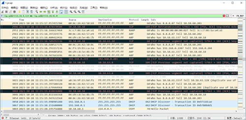 基于這樣的疑問,使用!ip.addr==10.16.3.110 &&!ip.addr==10.18.61.8過濾規則,查看其它的不屬于該終端的IP地址,發現了有些不屬于該終端的一些報文,黑色標識。特殊的是10.18.63.8這個IP地址并不存在于現場的設備中,但是報文中的MAC地址與192.168.61.8的MAC地址也相同。