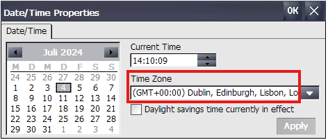 當給精智面板進行OS更新后,它的系統時區會恢復為默認值 (GMT+0) Dublin,Edinburgh,Lisbon,London。此時沒有改動時區設置,僅將日期時間調整為當時的測試時間,2024/7/4 14:10。