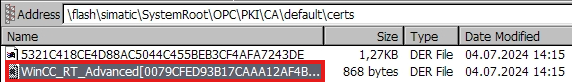下載程序后,精智面板上會自動創建OPC UA客戶端證書文件??梢钥吹阶C書的創建時間是GMT+0 時區的2024/7/4 14:15。