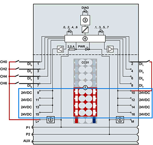 劃重點:淺色基座是開啟新一個電位組,與前面電位組隔離開。整個電位組的P1、P2、AUX是導通的,P1、P2總線由淺色基座的L+和M提供,一個電位組中如果有輔助端子,則可以對其中一個輔助端子指定電位,這樣AUX總線就有了相同的電位。
